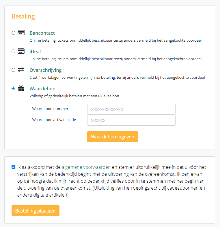 De op de website uitgevoerde bestellingen gelden als een vaste en definitieve verbintenis van de koper wanneer de koper heeft bevestigd onderhavige Algemene Voorwaarden te aanvaarden en zijn betaling heeft geregistreerd door één keer op de knop "Bestelling plaatsen" te klikken. Het contract tussen PLUSPAS en de Klant, met betrekking tot de levering van een Voucher, wordt beschouwd als zijnde geldig en aanvaard zodra voornoemde bestellingen door PLUSPAS via e-mail zijn bevestigd. Als blijk van de aanvaarding van de bestelling door PLUSPAS geldt de bevestigingsmail en/of het bijschrijven van de Voucher(s) op de Gebruikersaccount van de koper binnen de 48 uur vanaf het ogenblik dat de koper de bestelling heeft geplaatst.